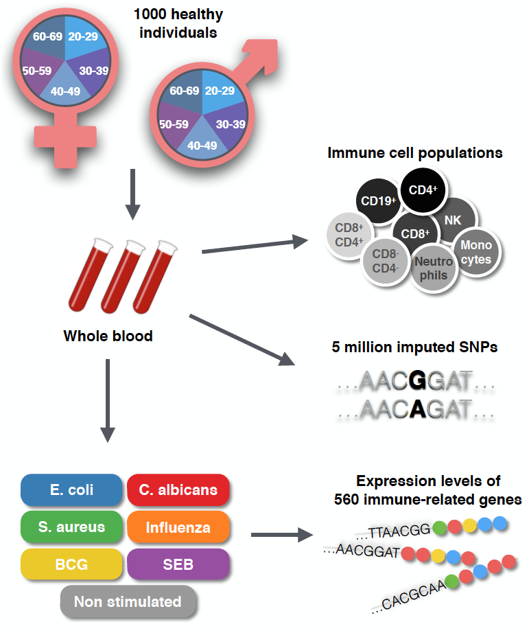 ABSTRACT Immune responses are highly variable between individuals and populations, with this variance mediated by many factors including age, sex, and genetics. To dissect how each of these factors contributes to differential immune responses we recruited 1,000 healthy donors as part of the Milieu Intereiur cohort that were equally stratified by age (20-70 years old) and sex (50:50). Whole blood from each donor was stimulated in a standardized approach with Escherichia coli, BCG, Staphylococcus aureus, SEB, Candida albicans and Influenza virus and the transcriptomic response was analyzed by Nanostring gene expression arrays. We show that age affects gene expression in a stimuli specific manner, while the effect of sex is more common across conditions. Both age and sex contribute to the expression of many immune-related genes but at a low level, while in contrast, the genetic effects are much stronger but relevant to fewer genes. Genetic analysis identified multiple eQTLs, both local and trans, for all stimuli induced responses, including a novel, strong trans-eQTL located near the CR1 gene after C. albicans stimulation. Finally, we employed a structural equation model to describe how age and sex effects are mediated by different immune cell populations. These results lay the foundations for understanding how age, sex, and genetics may impact differentially induced immune responses, which may be considered for future clinical strategies proposing stratified or precision medicine approaches.